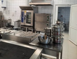 Питание в детском саду организовано в групповых комнатах. Весь цикл приготовления блюд осуществляется на пищеблоке, состоящем из цехов и кладовых для хранения продуктов. Помещение пищеблока размещается на первом этаже, имеет отдельными выходами и полностью оснащено оборудованием в соответствии с нормативными требованиями.